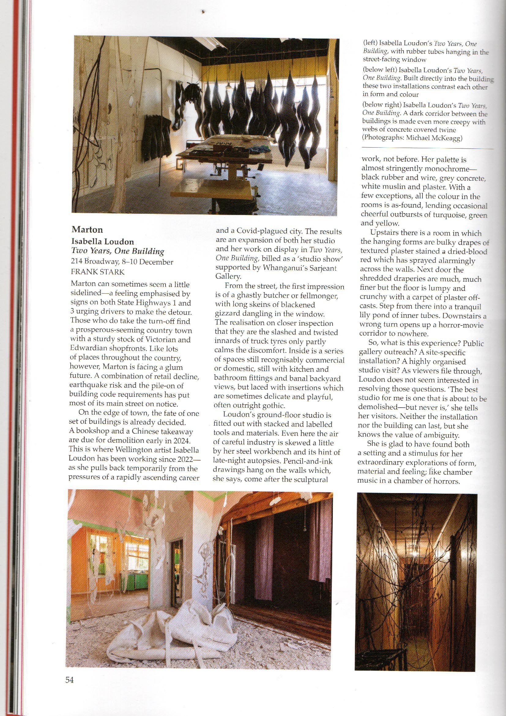On the edge of town, the fate of one set of buildings is already decided. A bookshop and a Chinese takeaway are due for demolition early in 2024. This is where Wellington artist Isabella Loudon has been working since 2022- as she pulls back temporarily from the pressures of a rapidly ascending career and a Covid-plagued city. The results are an expansion of both her studio and her work on display in Two Years, One Building, billed as a 'studio show' supported by Whanganui's Sarjeant Gallery.