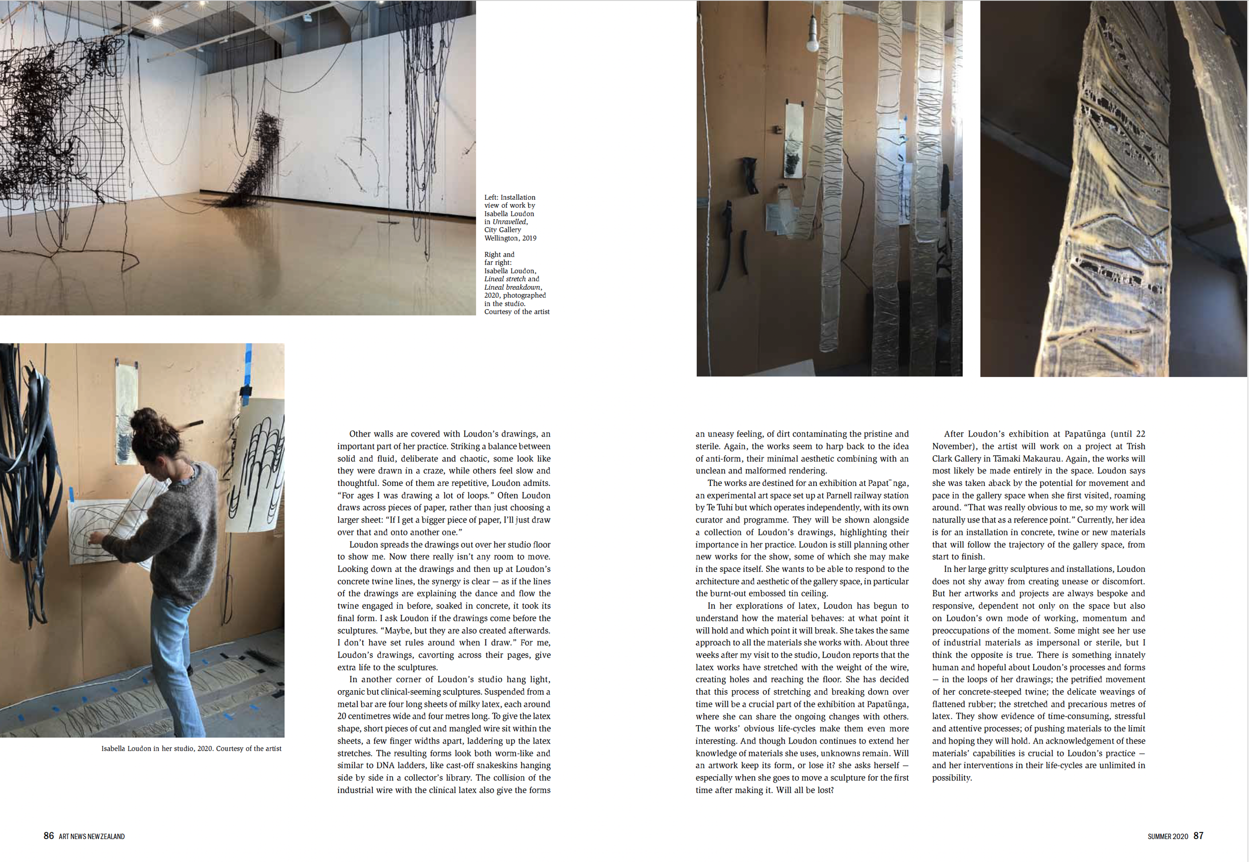 In her explorations of latex, Loudon has begun to understand how the material behaves: at what point it will hold and which point it will break. She takes the same approach to all the materials she works with. About three weeks after my visit to the studio, Loudon reports that the latex works have stretched with the weight of the wire, creating holes and reaching the floor. She has decided that this process of stretching and breaking down over time will be a crucial part of the exhibition at Papatūnga, where she can share the ongoing changes with others. The works’ obvious life-cycles make them even more interesting. And though Loudon continues to extend her knowledge of materials she uses, unknowns remain. Will an artwork keep its form, or lose it? she asks herself – especially when she goes to move a sculpture for the first time after making it. Will all be lost?