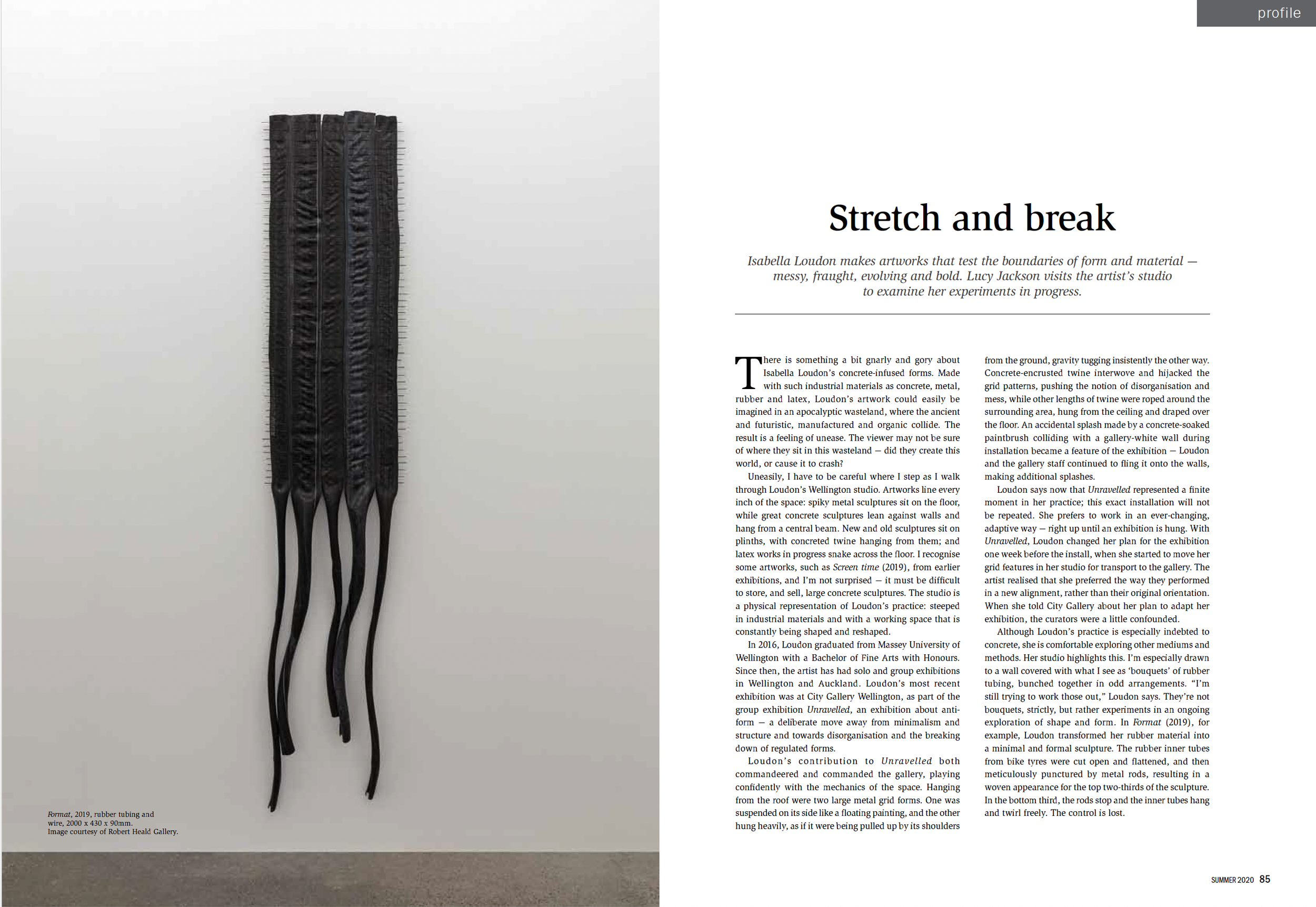 Although Loudon’s practice is especially indebted to concrete, she is comfortable exploring other mediums and methods. Her studio highlights this. I’m especially drawn to a wall covered with what I see as ‘bouquets’ of rubber tubing, bunched together in odd arrangements. “I’m still trying to work those out,” Loudon says. They’re not bouquets, strictly, but rather experiments in an ongoing exploration of shape and form. In Format (2019), for example, Loudon transformed her rubber material into a minimal and formal sculpture. The rubber inner tubes from bike tyres were cut open and flattened, and then meticulously punctured by metal rods, resulting in a woven appearance for the top two-thirds of the sculpture. In the bottom third, the rods stop and the inner tubes hang and twirl freely. The control is lost.