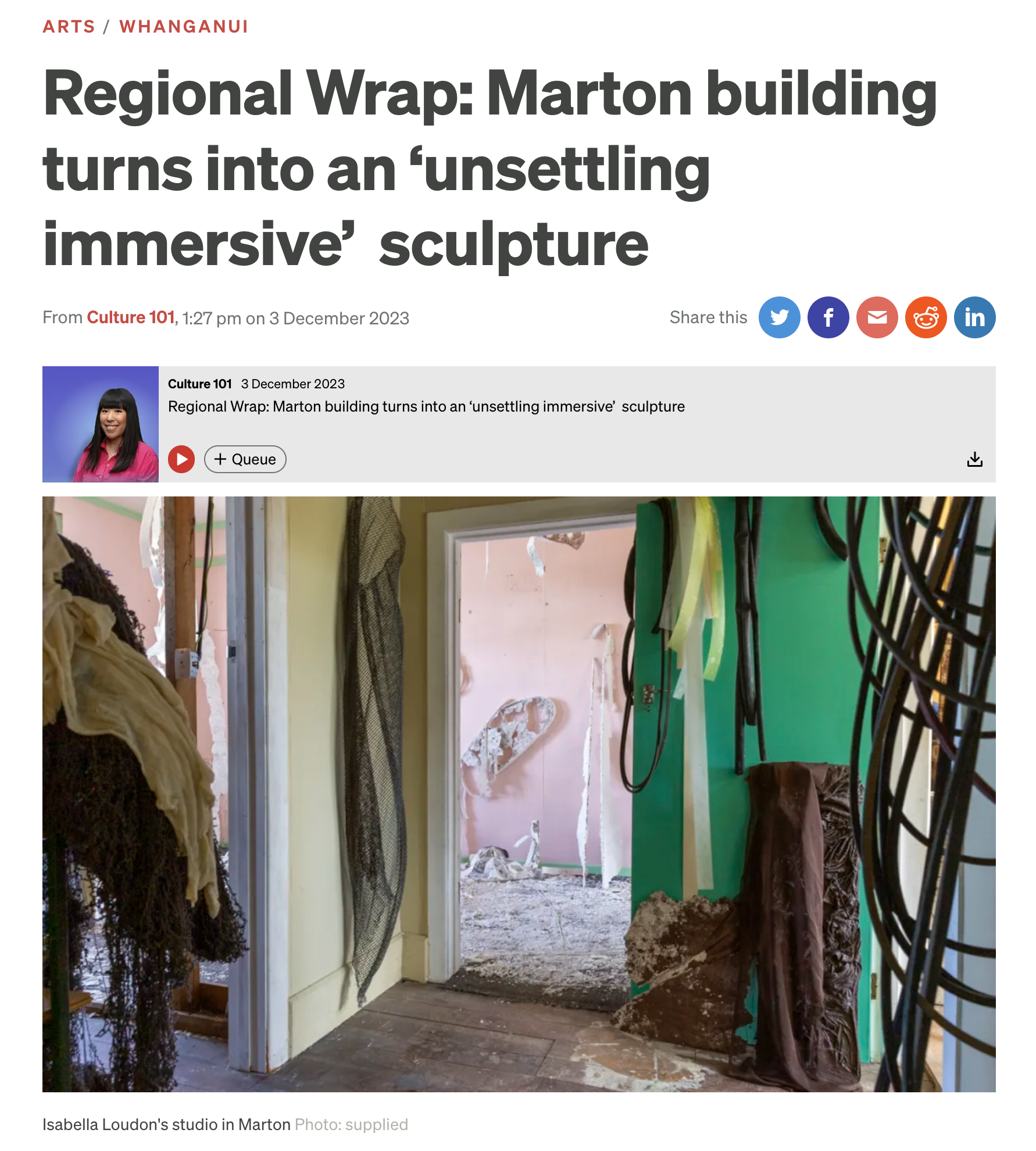 Loudon opens up her installation to the public, in partnership with Whanganui's Sarjeant Gallery Te Whare o Rehua, Friday December 8 to Sunday December 10, 11am-4pm, at 214 Broadway, Marton.