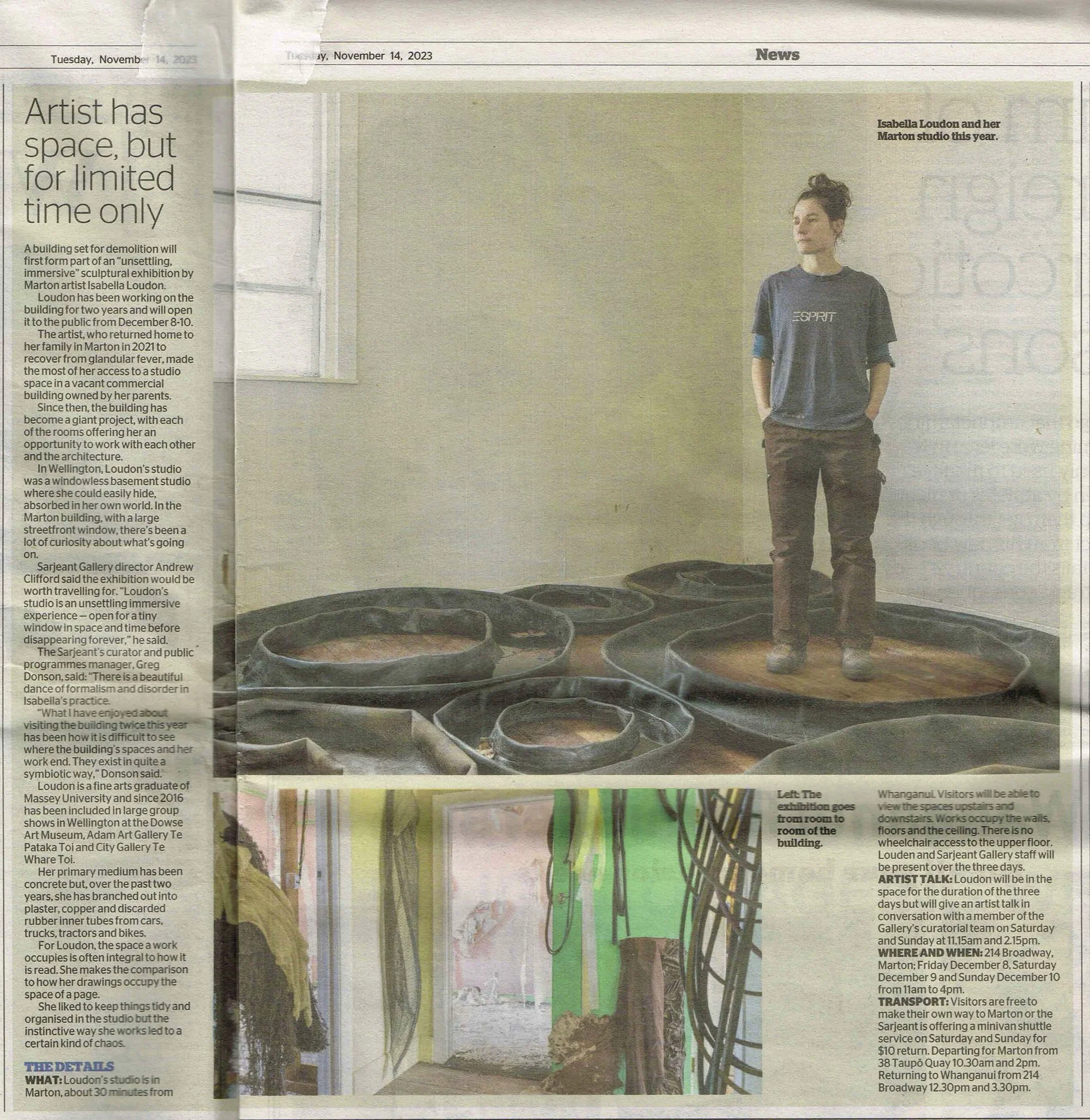 WHAT: Loudon’s studio is in Marton, about 30 minutes from Whanganui. Visitors will be able to view the spaces upstairs and downstairs. Works occupy the walls, floors and the ceiling. There is no wheelchair access to the upper floor. Loudon and Sarjeant Gallery staff will be present over the three days.