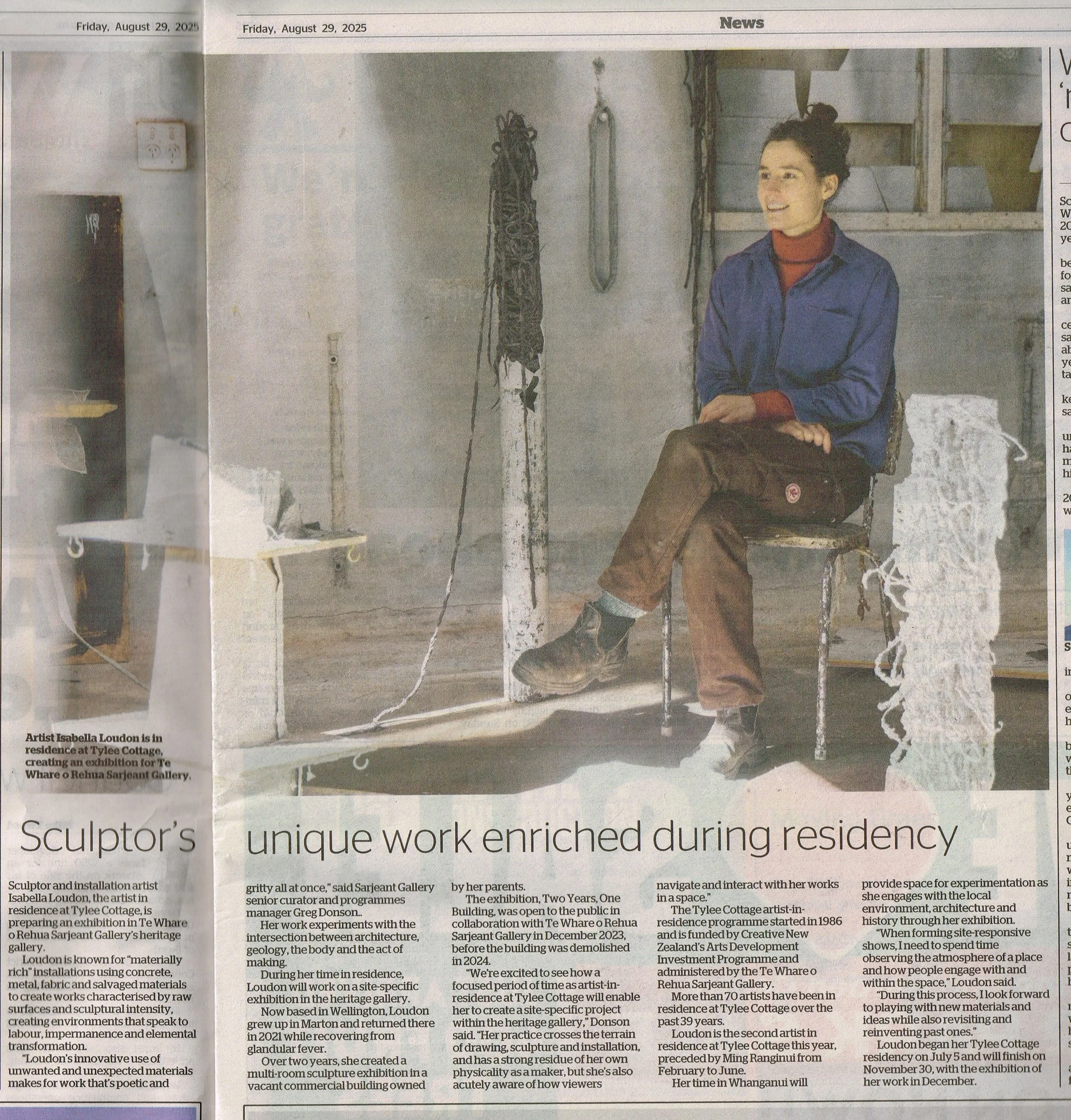 Te Whare o Rehua Sarjeant Gallery is pleased to welcome sculptor and installation artist Isabella Loudon as the artist in residence at Tylee Cottage. Loudon. Loudon’s residency period is from 5 July to 30 November 2025, developing a new body of work which will be exhibited at Te Whare o Rehua in December 2025. The Tylee Cottage residency programme is generously supported by Creative New Zealand.