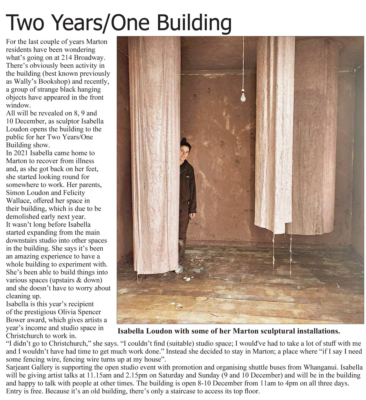 Sarjeant Gallery is supporting the open studio event with promotion and organising shuttle buses from Whanganui. Isabella will be giving artist talks at 11.15am and 2.15pm on Saturday and Sunday (9 and 10 December) and will be in the building and happy to talk with people at other times. The building is open 8-10 December from 11am to 4pm on all three days. Entry is free. Because it’s an old building, there’s only a staircase to access its top floor.