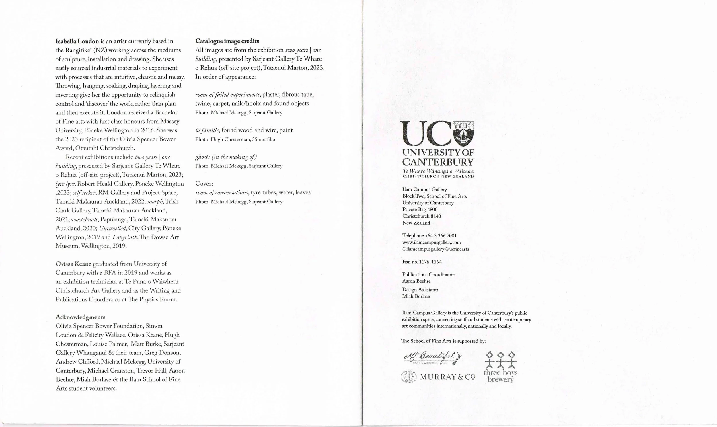 Olivia Spencer Bower Foundation, Simon Loudon & Felicity Wallace, Orissa Keane, Hugh Chesterman, Louise Palmer, Matt Burke, Sarjeant Gallery Whanganui & their team, Greg Donson, Andrew Clifford, Michael Mckegg, University of Canterbury, Michael Cranston, Trevor Hall, Aaron Beehre, Miah Borlase & the Ilam School of Fine Arts student volunteers.
