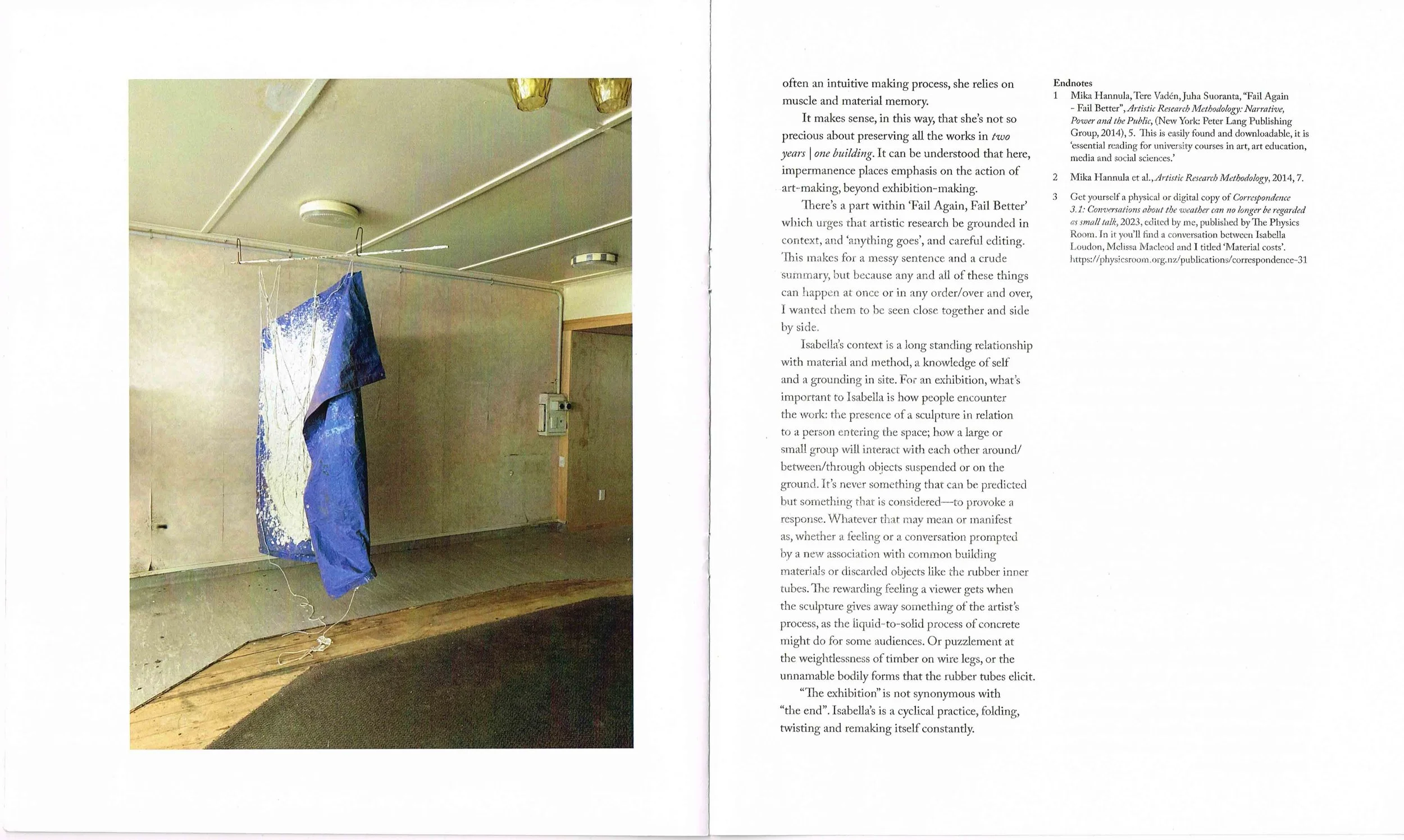 3. Get yourself a physical or digital copy of Correspondence 3.1: Conversations about the weather can no longer be regarded as small talk, 2023, edited by me, published by The Physics Room. In it you'll find a conversation between Isabella Loudon, Melissa Macleod and I titled ‘Material costs’. https://physicsroom.org.nz/publications/correspondence-31
