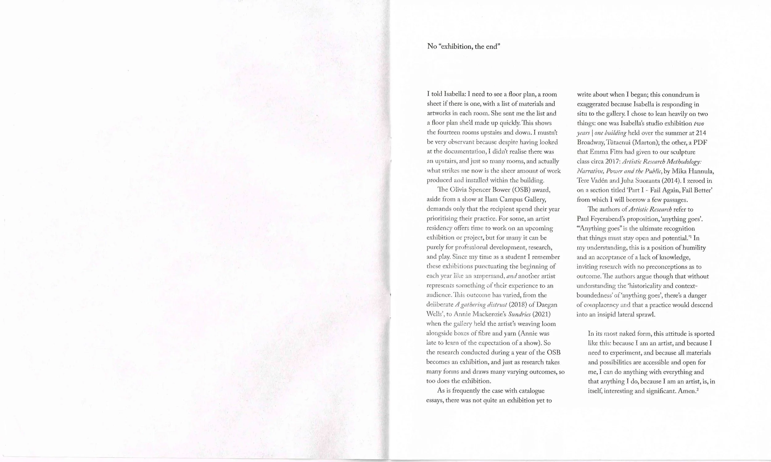 As is frequently the case with catalogue essays, there was not quite an exhibition yet to write about when I began; this conundrum is exaggerated because Isabella is responding in situ to the gallery. I chose to lean heavily on two things: one was Isabella’s studio exhibition two years I one building held over the summer at 214 Broadway, Tataenui (Marton); the other, a PDF that Emma Fitts had given to our sculpture class circa 2017: Artistic Research Methodology: Narrative, Power and the Public, by Mika Hannula, Tere Vaden and Juba Suoranta (2014). I zeroed in on a section titled ‘Part I – Fail Again, Fail Better’ from which I will borrow a few passages. The authors of Artistic Research refer to Paul Feyerabend's proposition, ‘anything goes’. “Anything goes” is the ultimate recognition that things must stay open and potential?01 In my understanding, this is a position of humility and an acceptance of a lack of knowledge, inviting research with no preconceptions as to outcome.