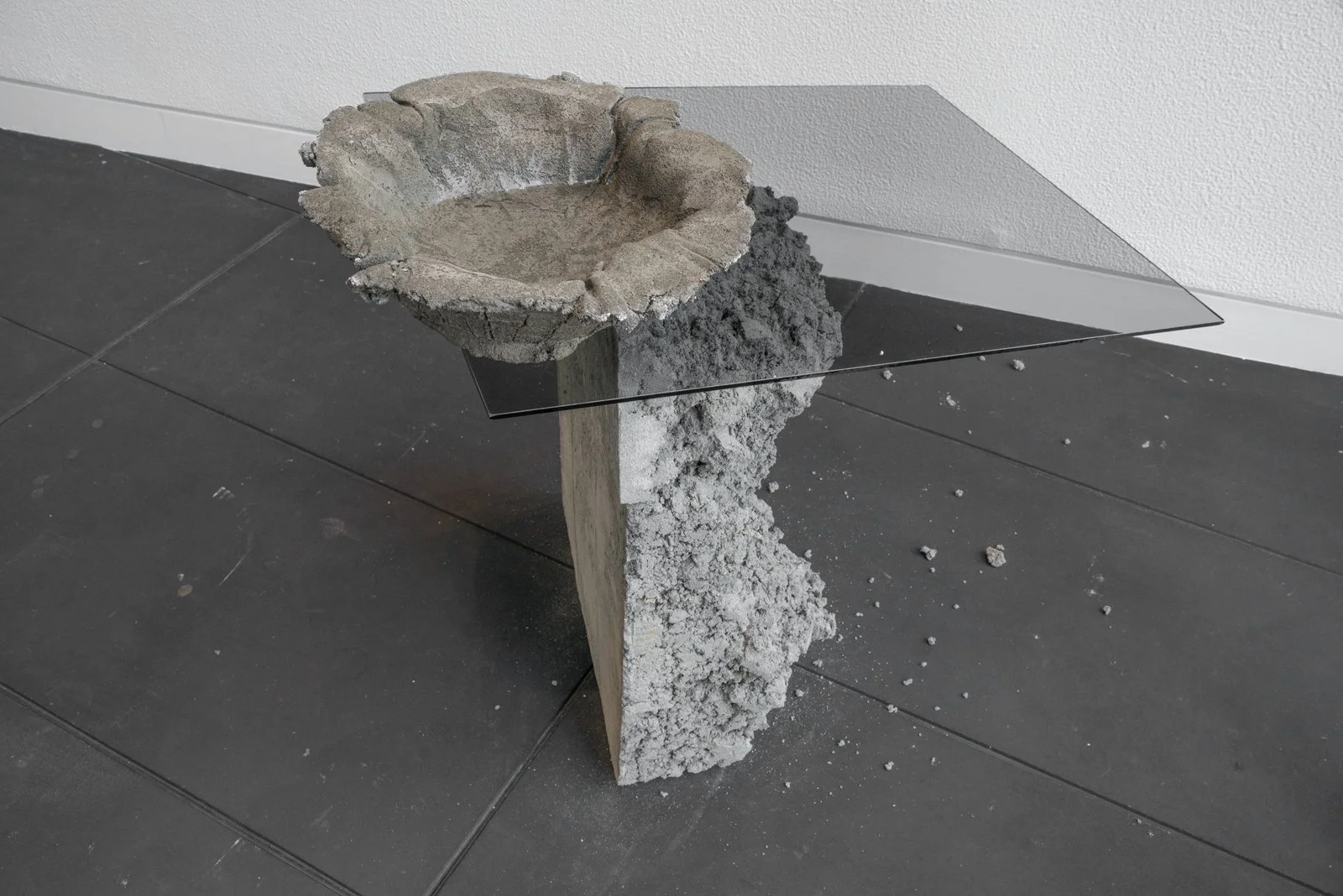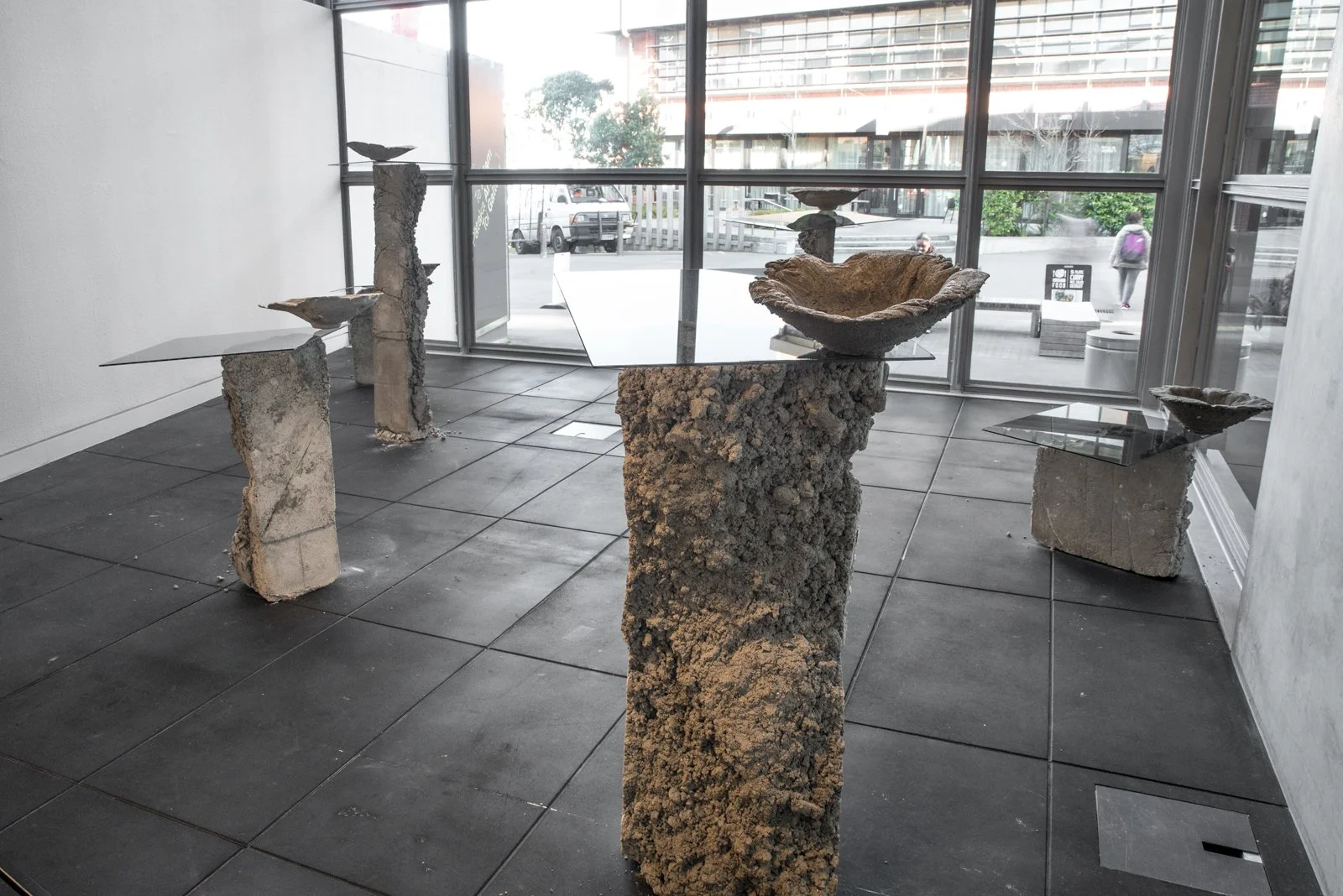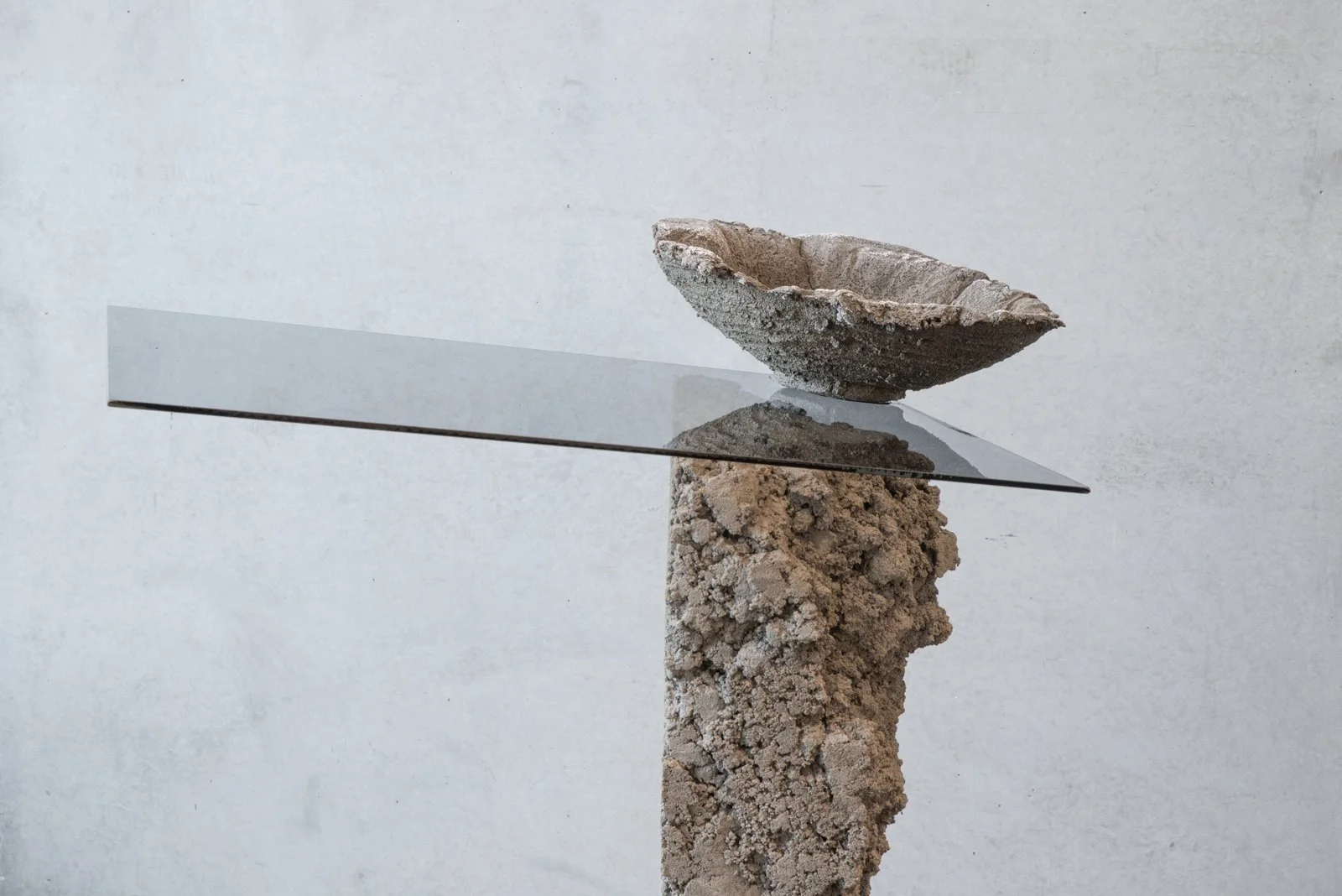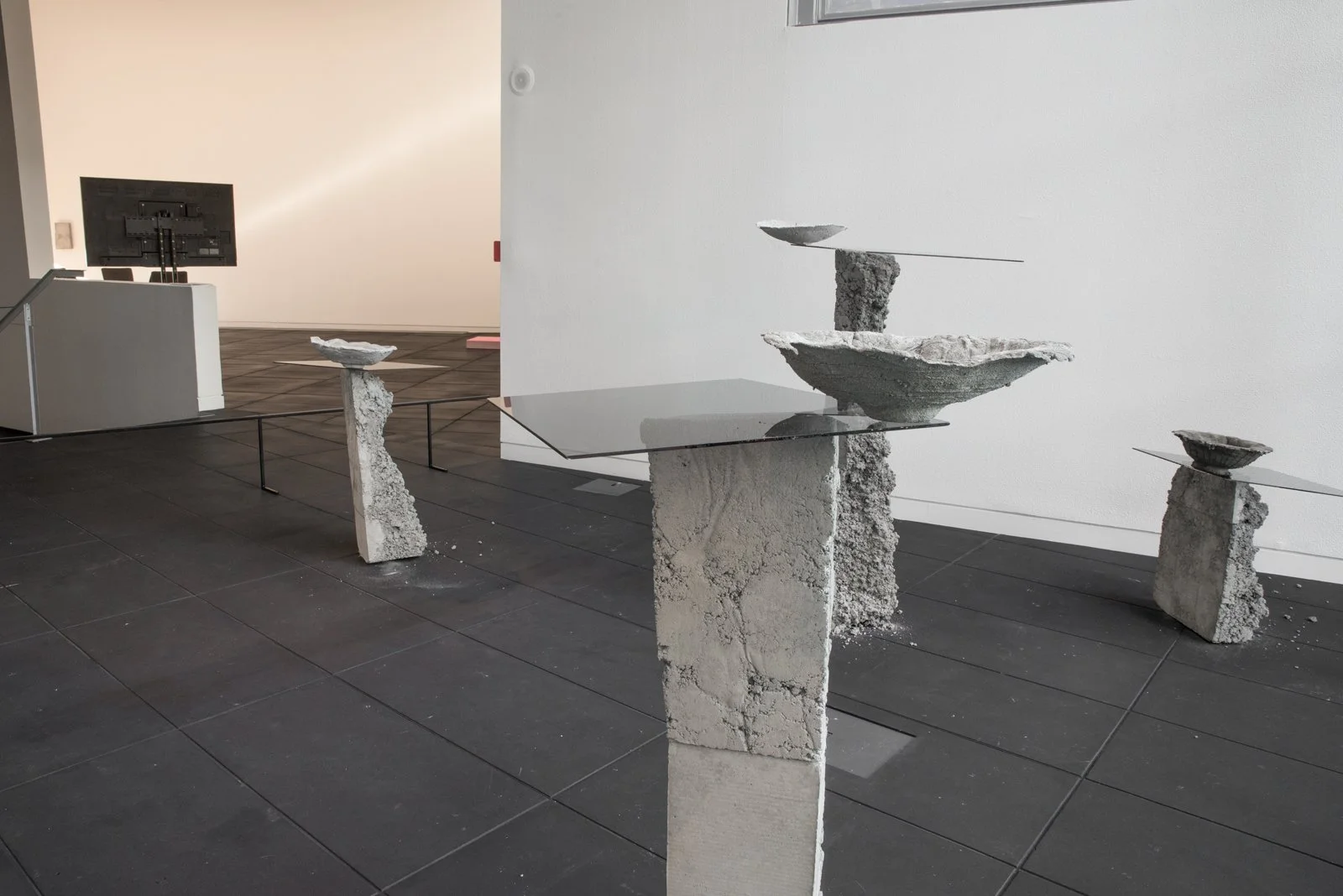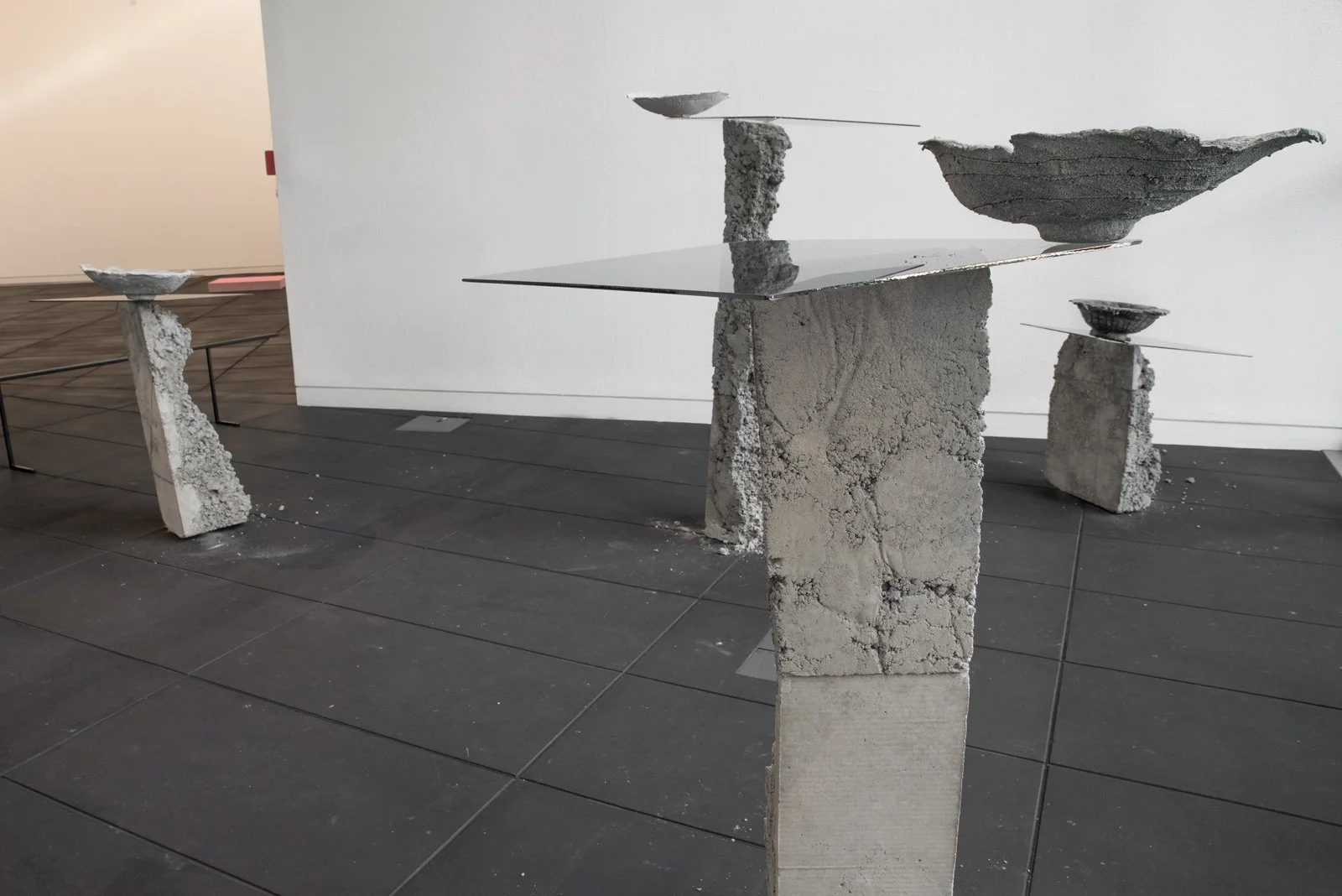 please water the sculptures, with care, 2017, concrete, tinted glass and water, five parts, dimensions variable